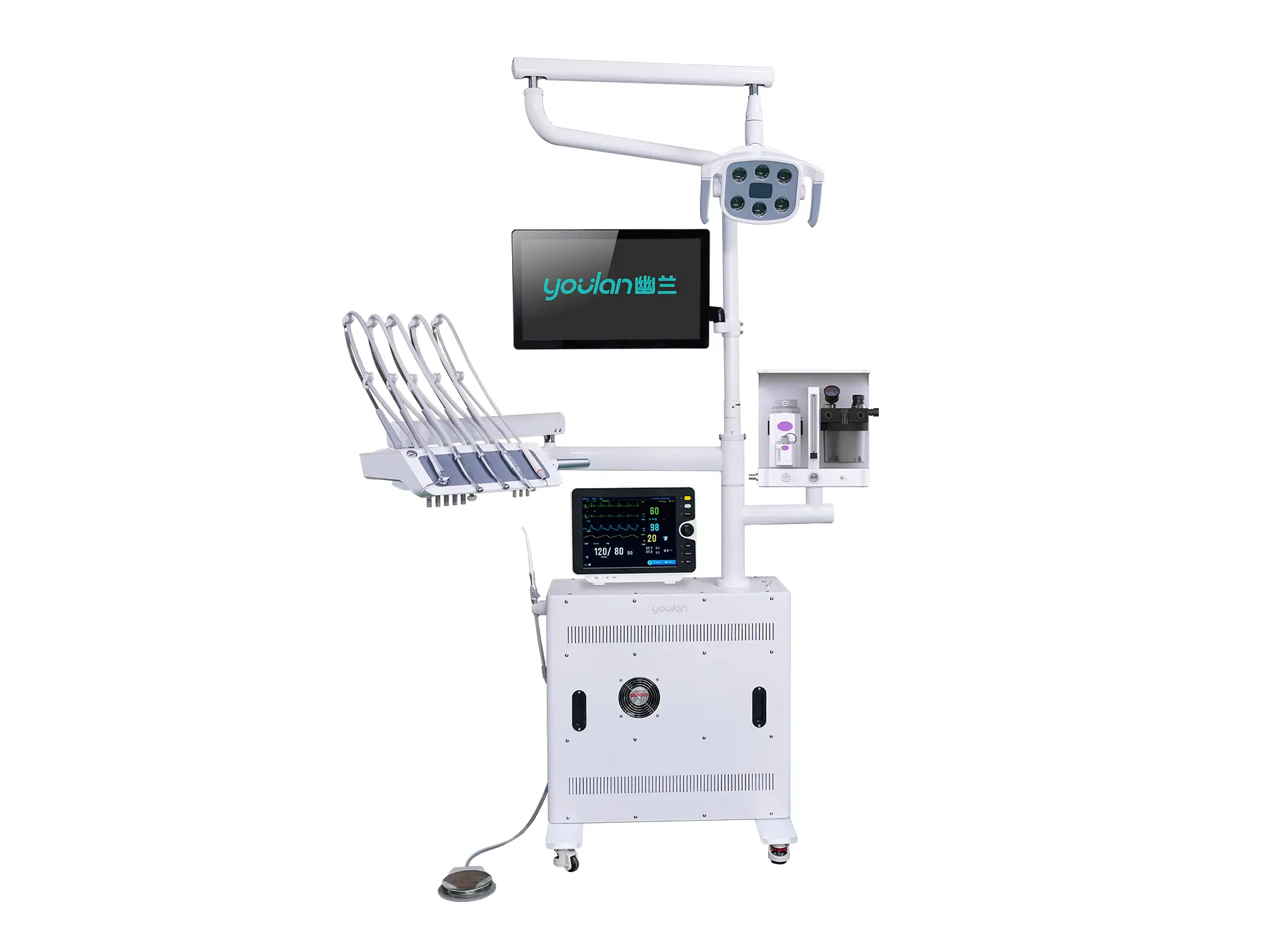 Asemassa liikuteltava hammashoitoyksikkö, instrumentti tasolla, hammashoitoon tarkoitettu varjoton led-valo, HD näyttö kuvien tarkastelua varten sekä valittavissa mm. inhalaatioanestesialaite ja potilasmonitori.